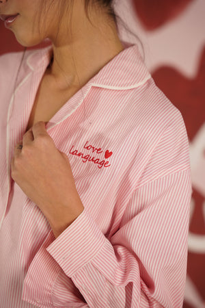 Crafted from premium Oxford cotton, this relaxed-fit shirt dress offers timeless elegance and comfort. Featuring a classic button-up design, it’s embroidered in red with "Love Language" on the chest and a beautiful phrase along the hem that celebrates love in multiple languages: "Ur my love, حبيبي, mi amor, amarي." A sophisticated piece with a meaningful touch